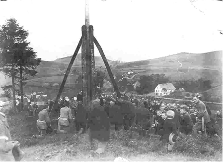 Nachdem unsere alte Vogelstange morsch und faul war, wurde vor einiger Zeit vom Schützen-Vorstande beschlossen eine neue anzuschaffen.Die neue Stange soll anstatt des Hölzernen Gestelles aus zwei eisernen 4 Meter langen U-Eisen 20 cm breit, 1 Meter tief in einen Cubick Meter Cememt Block in die Erde eingestapft werden, und über der Erde mit 2 verbindungs Eisen versehen werden. Die tannen Stange ist vom Schützen-Vorstand auf dem Platze angeliefert.Alle übrichen Sachen, wie Eisen, Cement, Ausschachten und das fertige aufstellen hat der Unternehmer zu besorgen. Der Unternehmer hat die Arbeit bis zum 15. Mai d. Jahres fertig zu stellen, und ein Jahr dafür zu haften. Nachdem vorstehende Bedingungen vorgelesen waren, wurde zum Verding geschritten, und blieb letztbietender mit 74 Mark Franz Schäfers.