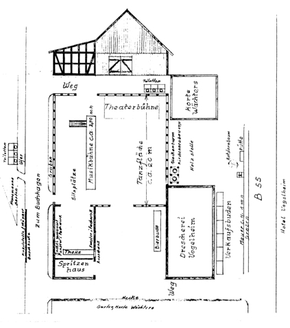 Grundriss der alten Schützenhalle (Skizze Gottfried Bornemann) In der Halle war in etwa 2,50 m Höhe eine Bühne für die Musikkapelle links neben der Tanzfläche angebracht. Auf diese führte eine sehr steile Treppe, die schon eher als Leiter angesehen werden konnte. Die Bühne war an der niedrigsten Stelle etwa 180 cm unter dem Blechdach, womit das Gebäude gedeckt war. Was mögen da bei Sonnenschein im Sommer Temperaturen gewesen sein!Man erzählt,dass in einem Jahre an Karneval das Bier in den Fässern gefroren sei. Nach unten war die Halle frei, sie stand auf Pfeilern, an der Gefälleseite etwa 1 m hoch, auch hier keine Isolierung, nur Fußbodenbretter. An der Nord-Ostseite konnte eine Theaterbühne aufgebaut werden. Die Halle stand auf dem Platz gegenüber Vogelheim, heute Olper Strasse 29, auf dem jetzt das Mietshaus von Hubert Hennes steht. Die schriftlichen Aufzeichnungen beginnen mit dem Jahr 1872. Bis 1878 findet das Schützenfest bei gutem Wetter unter freiem Himmel statt, sonst im Saal des Clemens Vogelheim. Im Jahre 1874 wird mit Vogelheim vereinbart, dass er seinen Hof für die Feier des Schützenfestes unentgeltlich zur Verfügung stellt und einrichtet. Bei schlechtem Wetter soll er den Saal für das Schützenfest überlassen, dafür erhält er pro Tag fünf Taler. Ein Taler hatte den Geldwert von 3 Mark. Aus dem Eintrag 10 Taler Auszahlung im Kassenbuch geht hervor, dass in diesem Jahre (1874) der Saal nur an zwei Tagen benutzt wurde. Zu dieser Zeit wird das Fest an Fronleichnam, dem folgenden Freitag und Sonntag gefeiert. An Samstagen sollten keine Feierlichkeiten stattfinden, damit die Sonntagsheiligung nicht gefährdet würde. Im Jahr 1876 soll Vogelheim für den Saal 15 Mark pro Tag erhalten, es sind aber nur neun Mark für eineinhalb Stunden ausbezahlt worden. Wahrscheinlich war wider Erwarten das Wetter so gut, dass man sich doch zur Feier unter freiem Himmel entschlossen hatte.