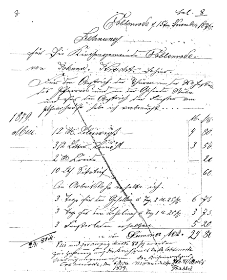 Theodor Plugge übernimmt im Jahre 1879 den Auf- und Abbau des Schützenzeltes und der Trinkbuden, Bänke und Tische nach Weisung des Schützenvorstandes gegen ein Entgelt von 10 Mark 95. Vogelheim übernimmt das Aufstellen der Buschhecke für den Schützenplatz für eine Mark. Um eine Vorstellung über den Geldwert der damaligen Zeit zu bekommen, sei hier eine Rechnung an die Pfarrgemeinde aus dem Jahre 1879 beigefügt. Der Tageslohn betrug, wie daraus hervorgeht, 2,50 Mark. Diese Löhne sind bis etwa 1930 konstant geblieben, mit Ausnahme der Inflationszeit in den zwanziger Jahren des 20. Jahrhunderts.