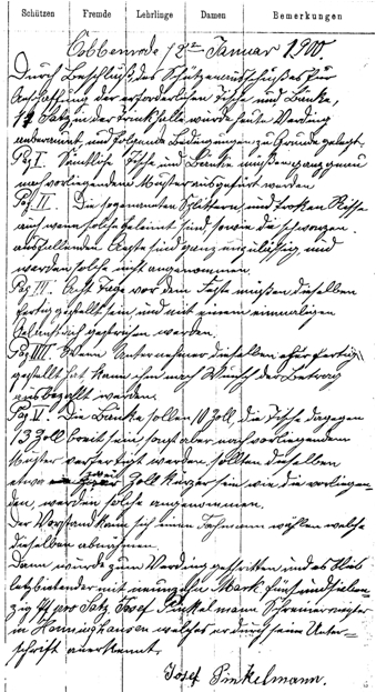 Die Bänke sollen 10 Zoll, die Tische dagegen 13 Zoll breit sein, sonst aber nach vorliegendem Muster verfertigt werden sollten dieselben etwa zwei Zoll kürzer sein wie die vorliegenden, werden solche angenommen.Der Vorstand kann sich einen Fachmann wählen, welche dieselben abnähmen.Dann wurde zum Verding geschritten und es blieb letztbietender mit neunzehn Mark fünfundsiebenzig Pf pro Satz. Josef Pinkelmann Schreinermeister in Henninghausen welches er durch seine Unterschrift anerkannt.