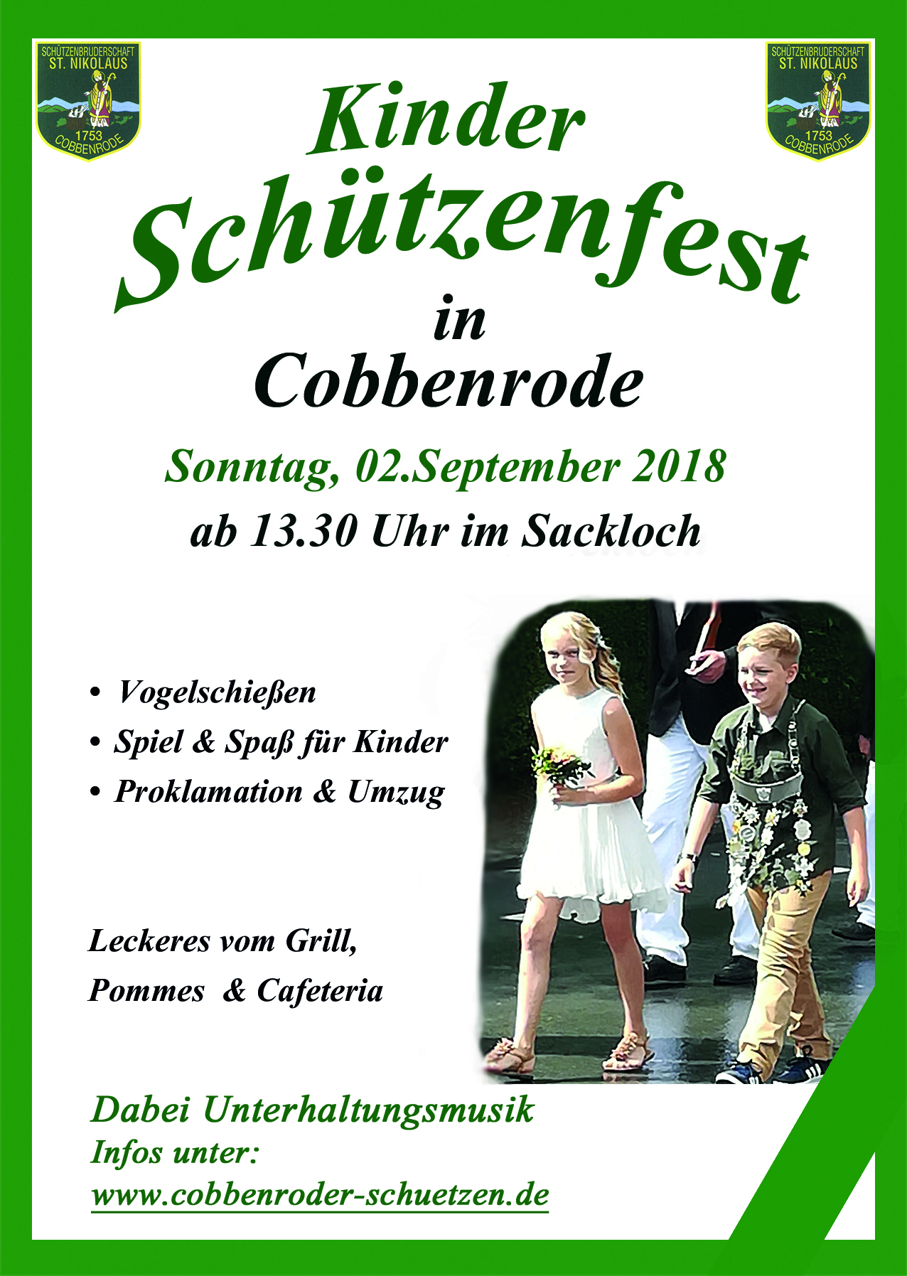 Die Schützenbruderschaft lädt am Sonntag den 02.September 2018 zum diesjährigen Kinderschützenfest ein.