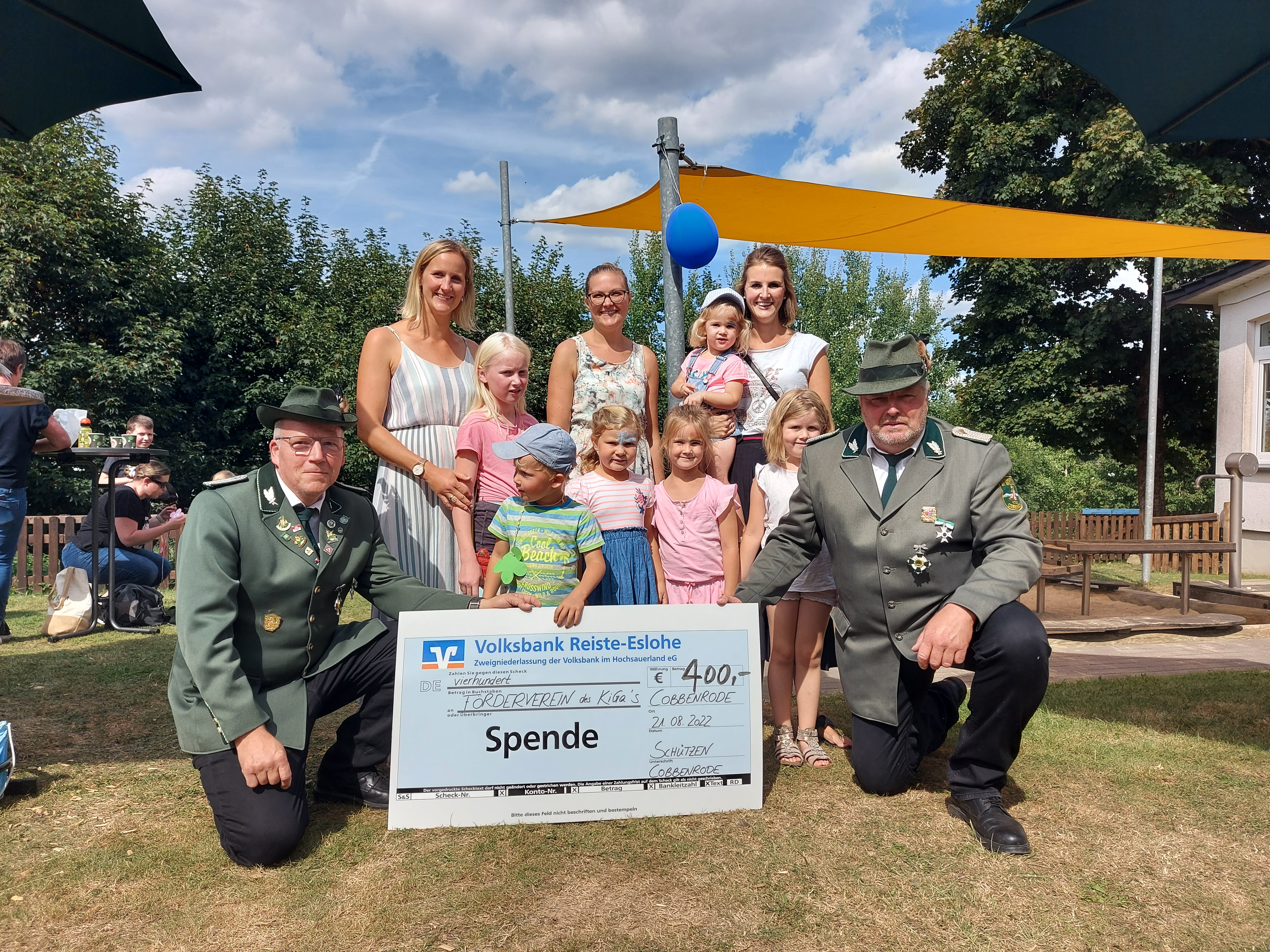 Im Rahmen eines Familienfests am Kindergarten Cobbenrode, konnten Andreas Kranauge (links im Bild) und Klaus Rickers (rechts im Bild) bei strahlend blauem Himmel die Spende übergeben.
