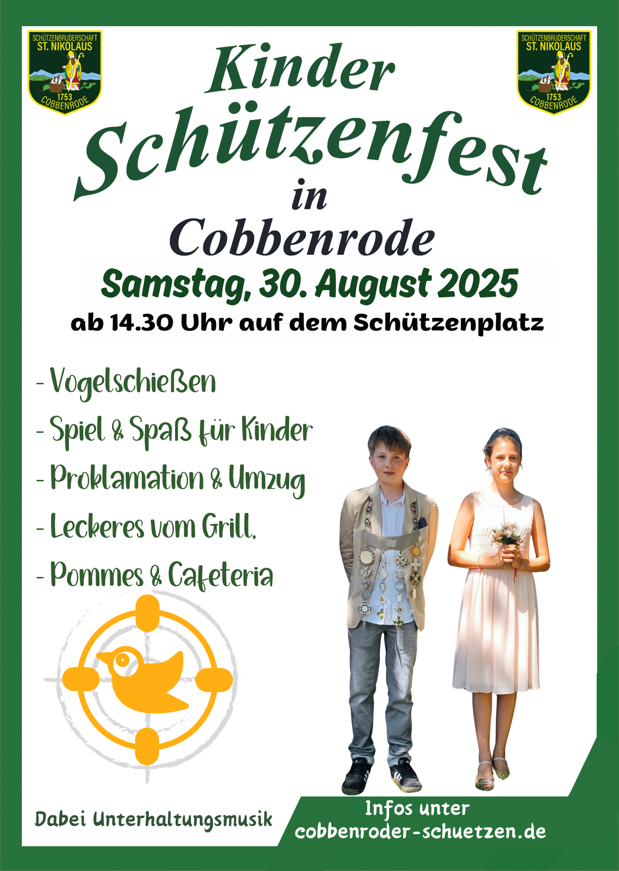 Die Schützenbruderschaft lädt am Samstag den 30.August 2025 zum diesjährigen Kinderschützenfest ein.